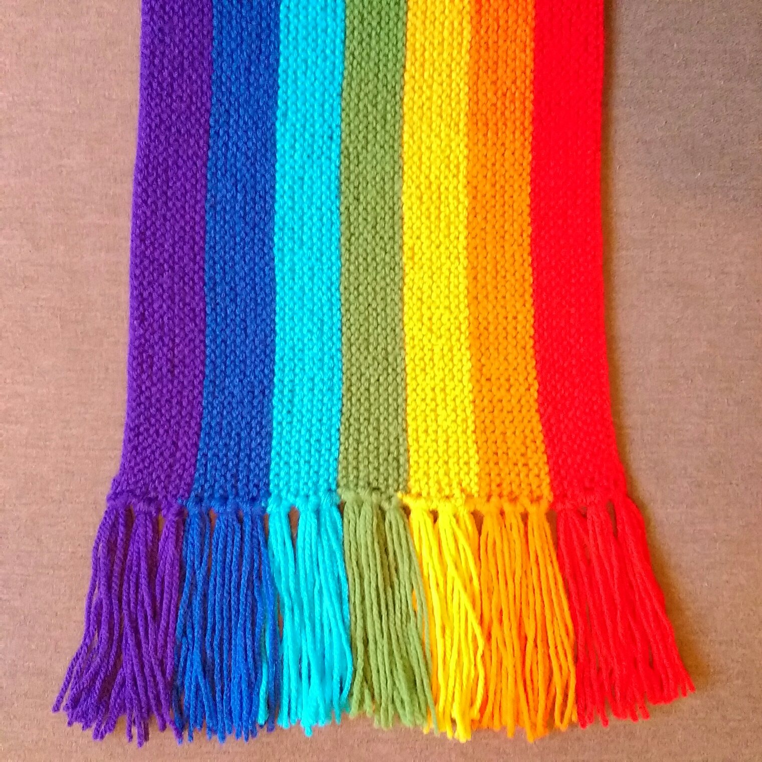 (CAT) Per fer aquesta bufanda cal trobar els set colors de l'arc de Sant Martí en els tons adequats. En un primer moment sembla fàcil, però comences a buscar i et trobes que en una marca el verd no es adequat, en una altre, el groc no queda bé amb la resta, en una altra el lila no lliga amb els altres. Així que finalment, vaig trobar que amb la marca Leda tenia els colors que volia. No acostumo a teixir amb llana acrílica, però necessitava els tons de colors que tenien a la seva gama, i he de reconèixer, que pel preu, i tot i ser acrílica, el tacte es prou agradable com per no picar. No deixa de ser acrílic, amb lo qual, la llana no té el punt d'elasticitat que ofereixen les llanes 100% merino. La segona dificultat que em vaig trobar va ser que per fer un arc de Sant Martí les ratlles havien de ser allargades. La única manera d'aconseguir-ho es teixir a lo llarg. Vaig haver de fer una mostra per saber quants punts necessitava per fer una bufanda de dos metres. Segons la meva mostra, vaig haver de muntar 400 punts. Amb tants punts vaig necessitar agulles circulars de 4mm amb un cable 1.5 metres (el més llarg que tinc). Cada volta em treia 10 minuts del meu temps... així que es feia molt llarg avançar en aquest projecte. La vaig fer tota a punt del dret, donant la volta al acabar la fila. Cada 14 voltes canviava de color, així que al teixir els 7 colors, la bufanda tenia una amplada de 23cm. Tot i així, la mida recomanada per a una bufanda d'home adult és de 1,8m de llarg per 25cm d'ample. Per acabar la feina vaig afegir serrells als dos extrems de la bufanda, d'aquesta manera em vaig estalviar rematar els fils. Com obligatòriament s'ha de comprar una troca de cada color, m'ha sobrat llana com per fer una segona bufanda. Més detalls a Ravelry.